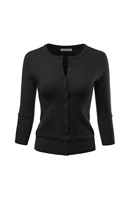 - Casual Basic Slim Fit 3/4 Sleeve Button Down Crewneck Stretch Knit Cardigan Sweater