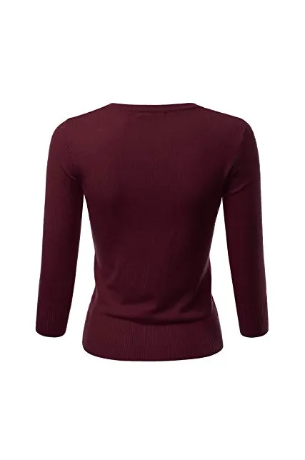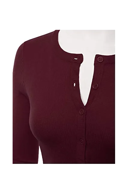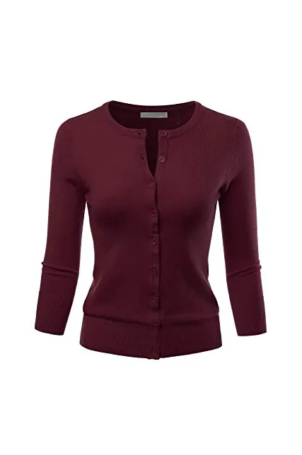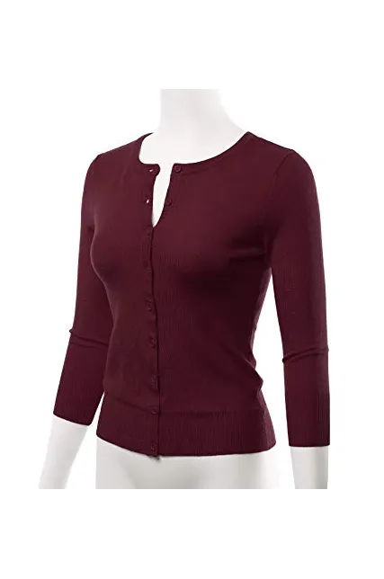 - Casual Basic Slim Fit 3/4 Sleeve Button Down Crewneck Stretch Knit Cardigan Sweater