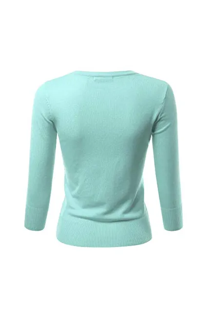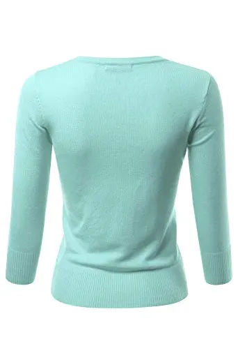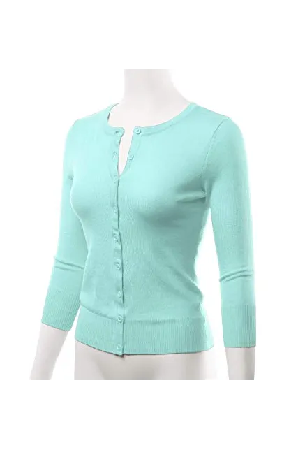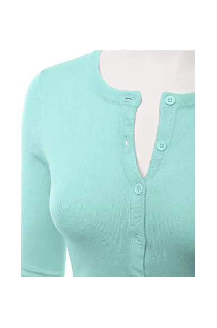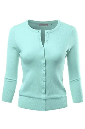 - Casual Basic Slim Fit 3/4 Sleeve Button Down Crewneck Stretch Knit Cardigan Sweater