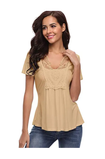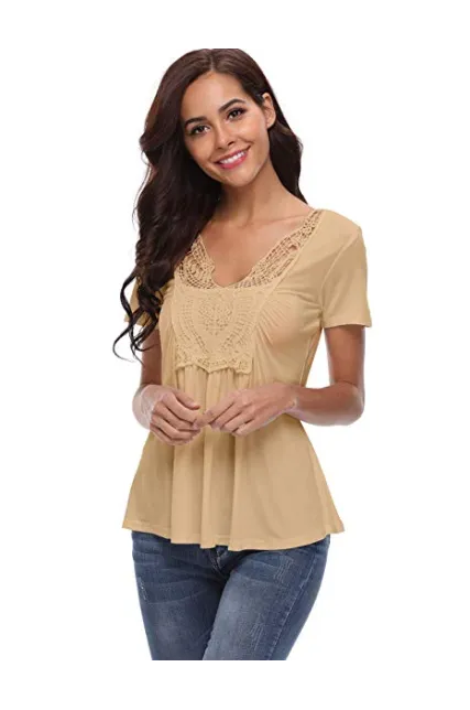 - ❤ Fashion peplum tops, Sexy style, a little low cut, crochet is feminine and flutter sleeves perfect, hide your belly. Fitted through the shoulders and bust and loose around the stomach. The Peplum style hides your belly!