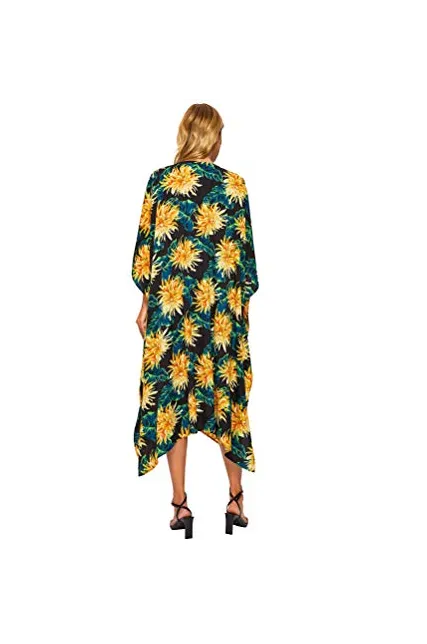 - Features: tropical style, leaf print, half sleeves, open front cardigan, maxi length