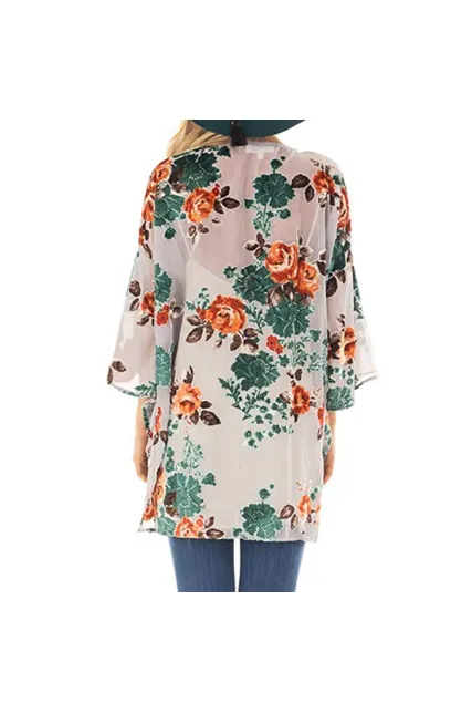 Women's Floral Print Puff Sleeve Kimono Cardigan Loose Cover Up Casual Blouse Tops