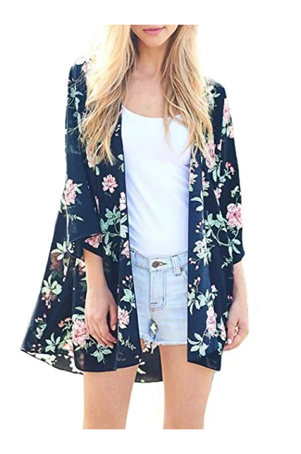 Women's Floral Print Puff Sleeve Kimono Cardigan Loose Cover Up Casual Blouse Tops
