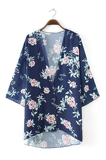 Women's Floral Print Puff Sleeve Kimono Cardigan Loose Cover Up Casual Blouse Tops