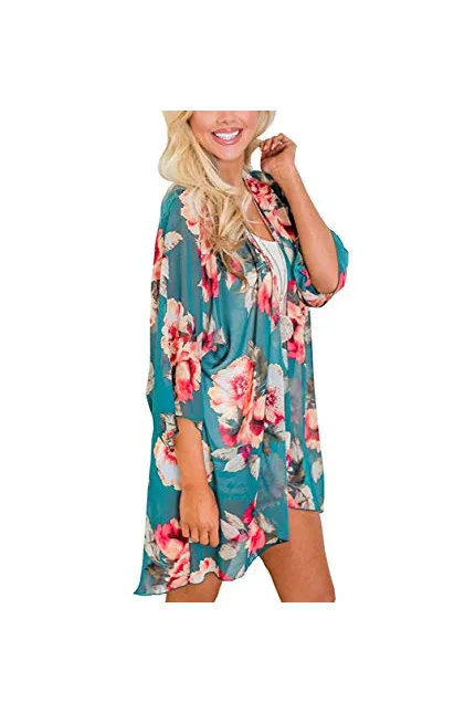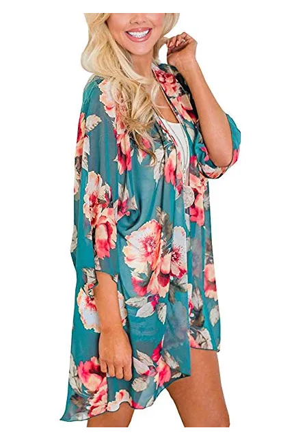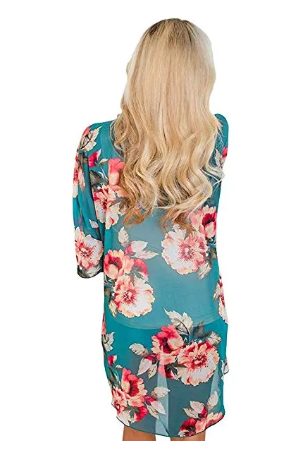 - Womens Floral Print Loose Puff Sleeve Kimono Cardigan Lace Patchwork Cover up Blouse