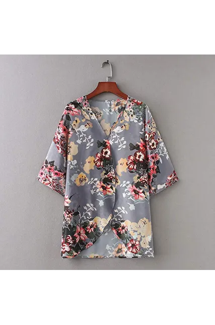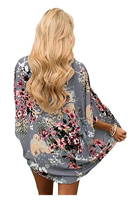 Women's Floral Print Puff Sleeve Kimono Cardigan Loose Cover Up Casual Blouse Tops