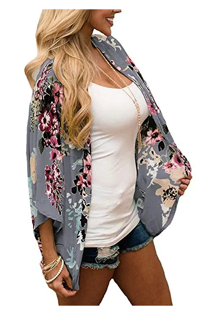 Women's Floral Print Puff Sleeve Kimono Cardigan Loose Cover Up Casual Blouse Tops