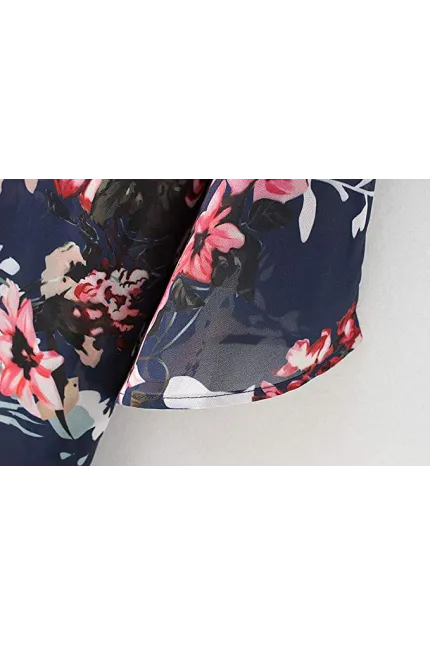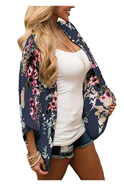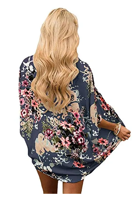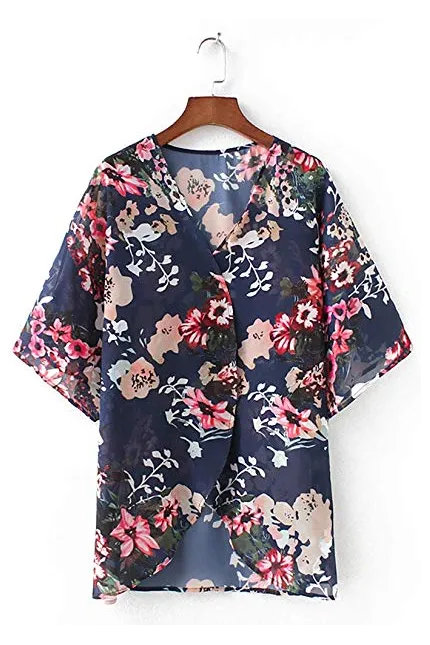- Womens Floral Print Loose Puff Sleeve Kimono Cardigan Lace Patchwork Cover up Blouse