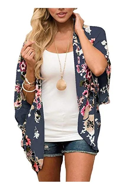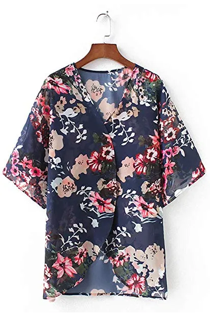 Women's Floral Print Puff Sleeve Kimono Cardigan Loose Cover Up Casual Blouse Tops