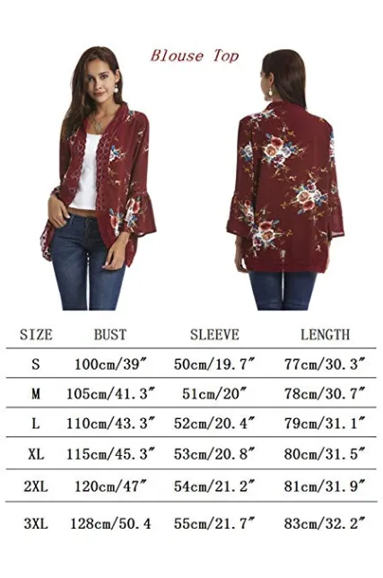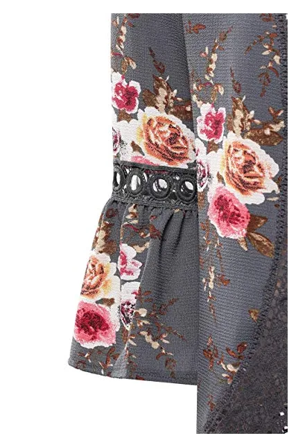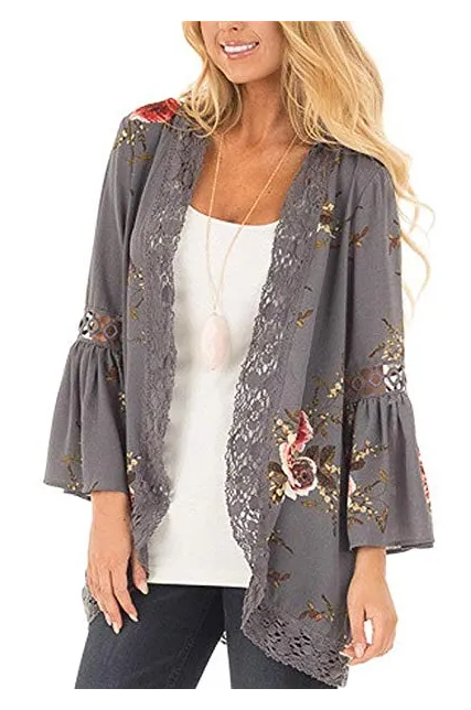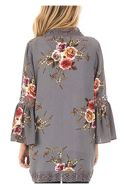 - Cover-ups/ Floral Printed Kimonos/Loose Cardigan/Beach wear/ Open Front/ 3 4 Sleeve /Flare Bell Sleeve/Lace Patchwork/Thin coat /Tops for women