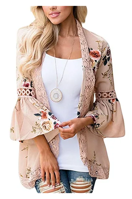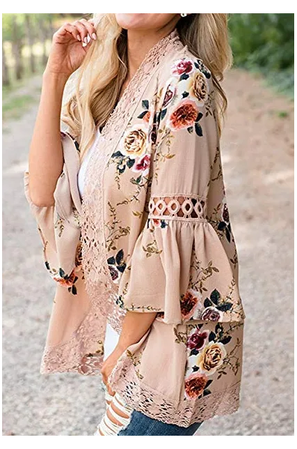 - Cover-ups Capes/ Flower Printed Kimonos/Loose Cardigan/Plus size /Beach wear/Swimwear suit/Maternity/ Open Front/ 3 4 Sleeve /Flare Bell Sleeve/Lace Patchwork/Thin coat /Blouse Tops for women