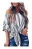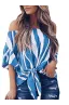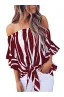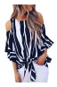 Asvivid Women's Striped Off Shoulder Bell Sleeve Shirt Tie Knot Casual Blouses Tops