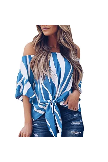 Asvivid Women's Striped Off Shoulder Bell Sleeve Shirt Tie Knot Casual Blouses Tops
