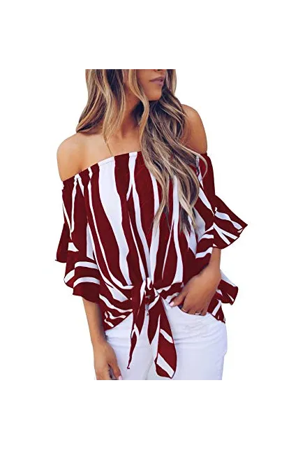 Asvivid Women's Striped Off Shoulder Bell Sleeve Shirt Tie Knot Casual Blouses Tops