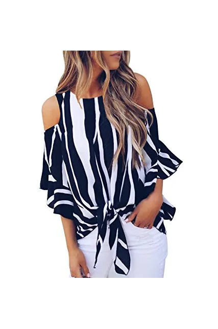 Asvivid Women's Striped Off Shoulder Bell Sleeve Shirt Tie Knot Casual Blouses Tops