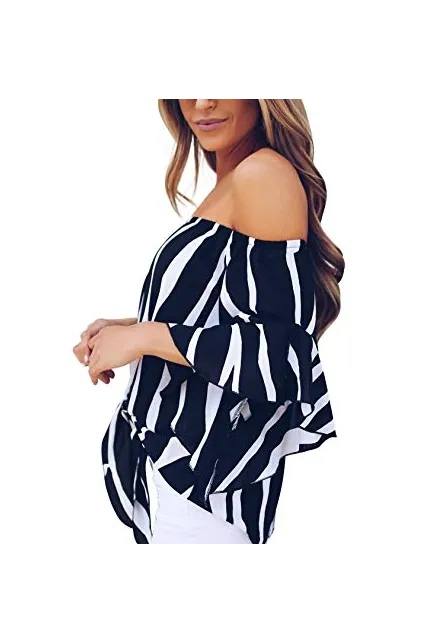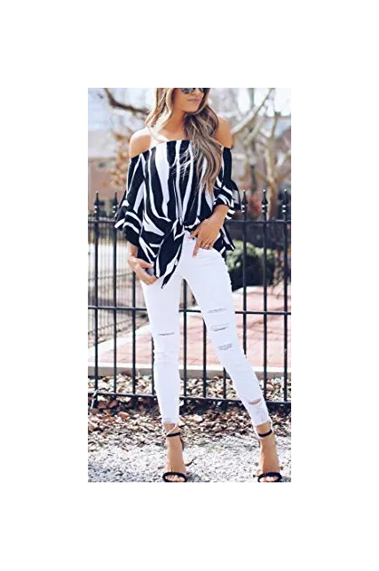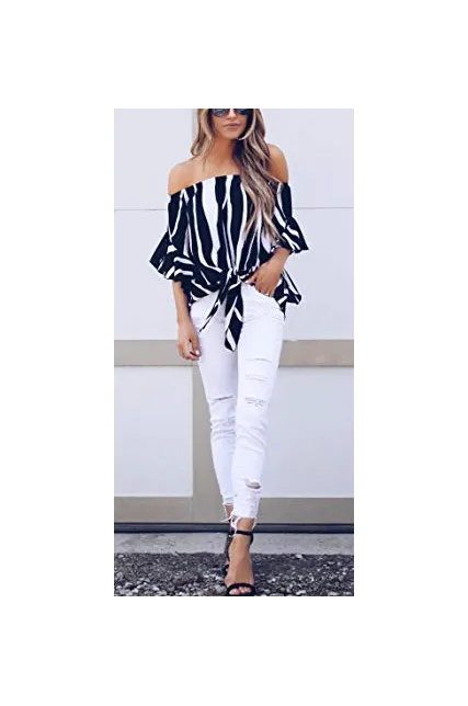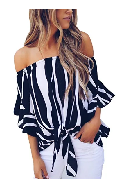 Asvivid Women's Striped Off Shoulder Bell Sleeve Shirt Tie Knot Casual Blouses Tops