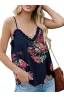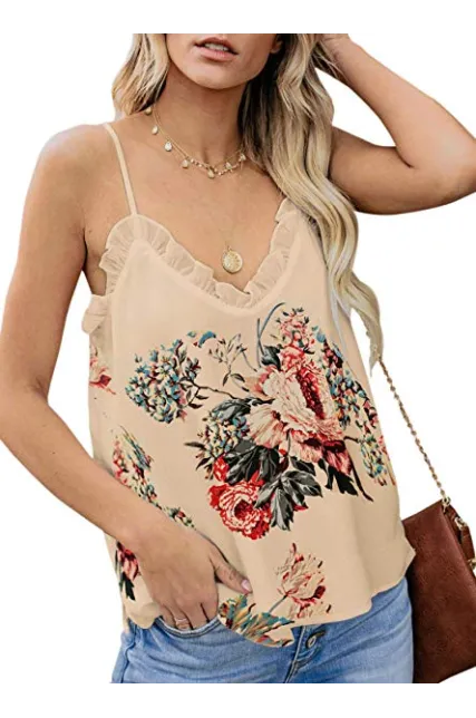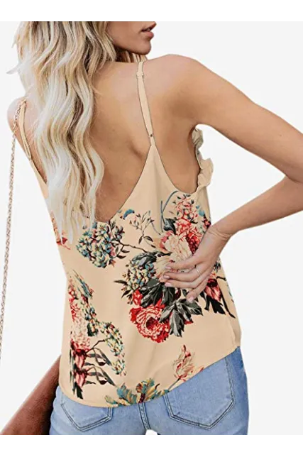 - Feature: Sexy V Neck with ruffle detail, Sleeveless, Loose Fit, Adjustable Spaghetti Strap, Solid Color Design