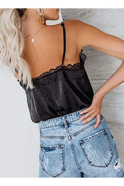 - Feature: Sexy V Neck, Sleeveless, Lace Strapy Trim, Loose Fit, Backless, Solid Color Design