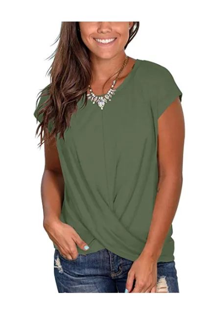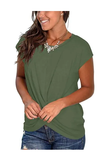 - Basic tees - This womens top features short sleeves, crew neckline and a twist in the front, a good choice to upgrade your plain and basic shirt.