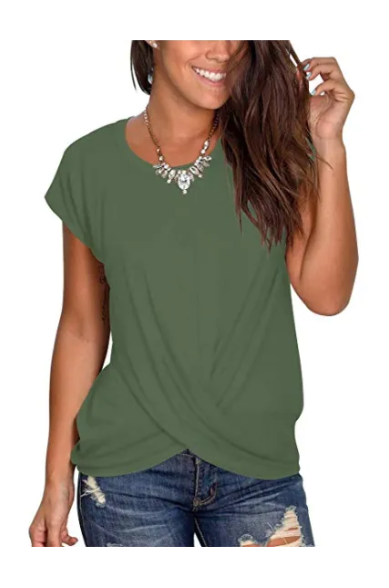 - Basic tees - This womens top features short sleeves, crew neckline and a twist in the front, a good choice to upgrade your plain and basic shirt.
