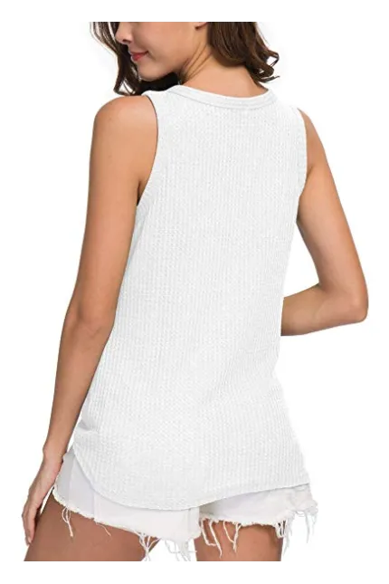 - Features: Waffle knitted blouse with button down design,Sexy V Neck,Sleeveless tunic tops, Curved hemline, Tie Front Hem design, Loose fit Plain Shirts