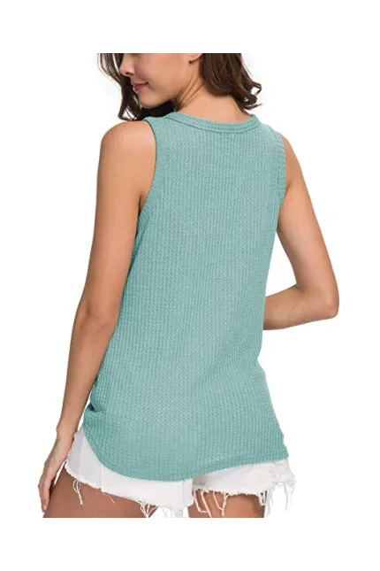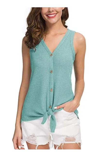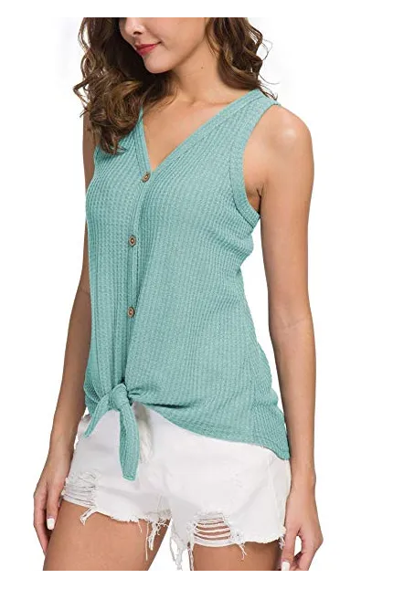- Features: Waffle knitted blouse with button down design,Sexy V Neck,Sleeveless tunic tops, Curved hemline, Tie Front Hem design, Loose fit Plain Shirts