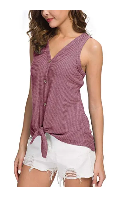 - Features: Waffle knitted blouse with button down design,Sexy V Neck,Sleeveless tunic tops, Curved hemline, Tie Front Hem design, Loose fit Plain Shirts