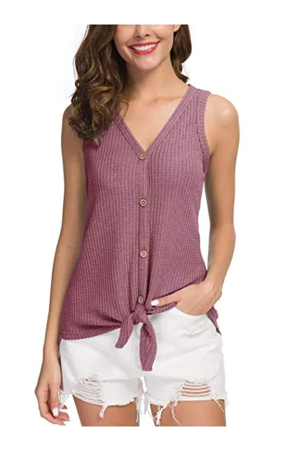 - Features: Waffle knitted blouse with button down design,Sexy V Neck,Sleeveless tunic tops, Curved hemline, Tie Front Hem design, Loose fit Plain Shirts