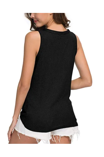 - Features: Waffle knitted blouse with button down design,Sexy V Neck,Sleeveless tunic tops, Curved hemline, Tie Front Hem design, Loose fit Plain Shirts