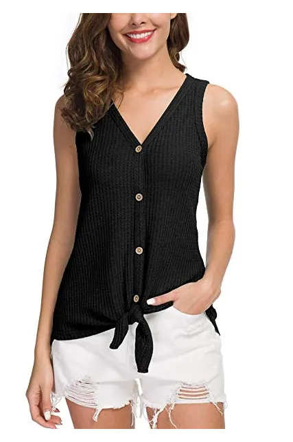 - Features: Waffle knitted blouse with button down design,Sexy V Neck,Sleeveless tunic tops, Curved hemline, Tie Front Hem design, Loose fit Plain Shirts