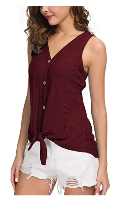 - Features: Waffle knitted blouse with button down design,Sexy V Neck,Sleeveless tunic tops, Curved hemline, Tie Front Hem design, Loose fit Plain Shirts