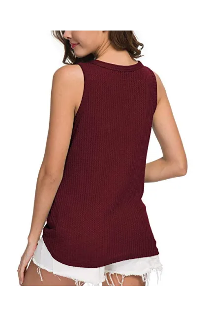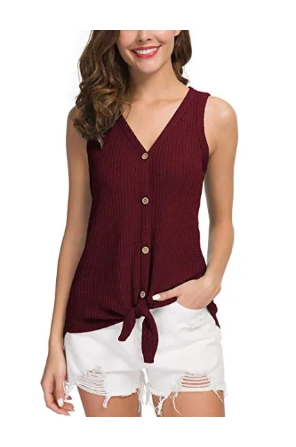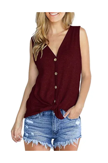 - Features: Waffle knitted blouse with button down design,Sexy V Neck,Sleeveless tunic tops, Curved hemline, Tie Front Hem design, Loose fit Plain Shirts