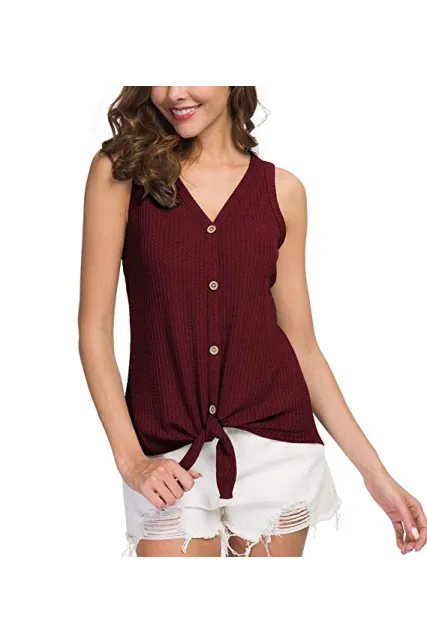 - Features: Waffle knitted blouse with button down design,Sexy V Neck,Sleeveless tunic tops, Curved hemline, Tie Front Hem design, Loose fit Plain Shirts