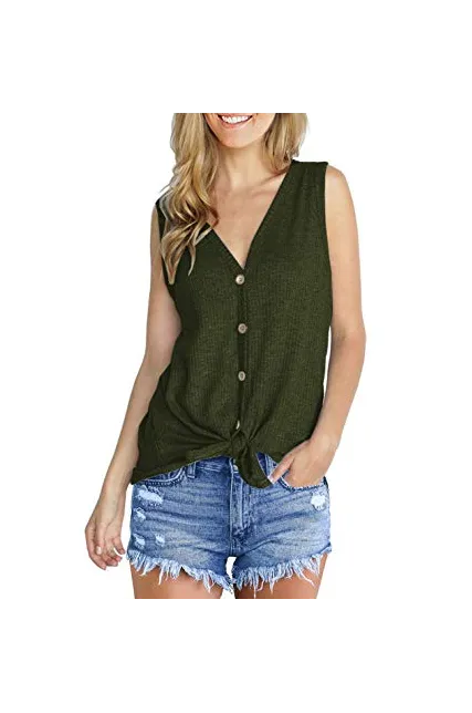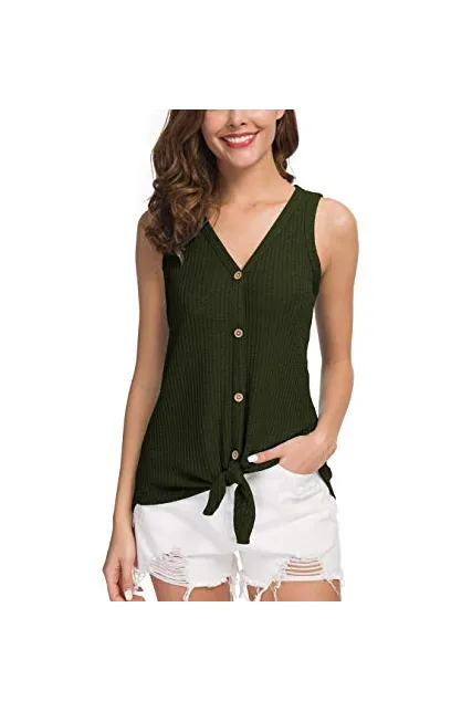 - Features: Waffle knitted blouse with button down design,Sexy V Neck,Sleeveless tunic tops, Curved hemline, Tie Front Hem design, Loose fit Plain Shirts