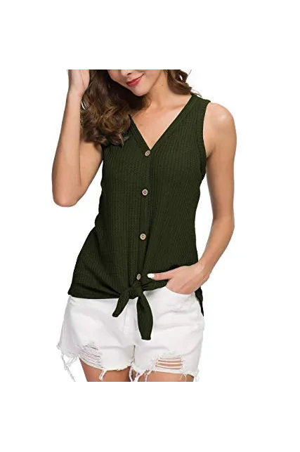 - Features: Waffle knitted blouse with button down design,Sexy V Neck,Sleeveless tunic tops, Curved hemline, Tie Front Hem design, Loose fit Plain Shirts
