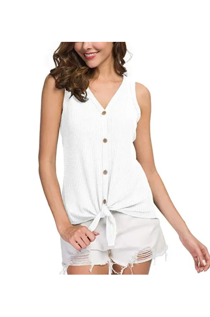 - Features: Waffle knitted blouse with button down design,Sexy V Neck,Sleeveless tunic tops, Curved hemline, Tie Front Hem design, Loose fit Plain Shirts