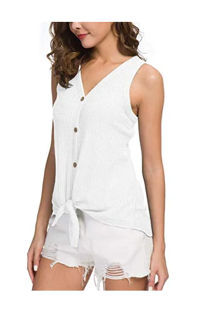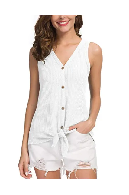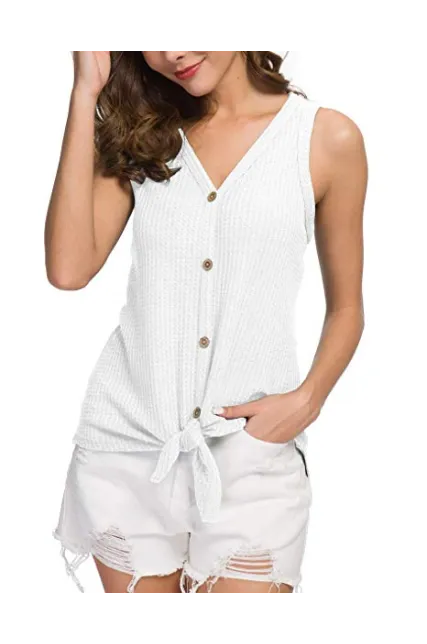 - Features: Waffle knitted blouse with button down design,Sexy V Neck,Sleeveless tunic tops, Curved hemline, Tie Front Hem design, Loose fit Plain Shirts