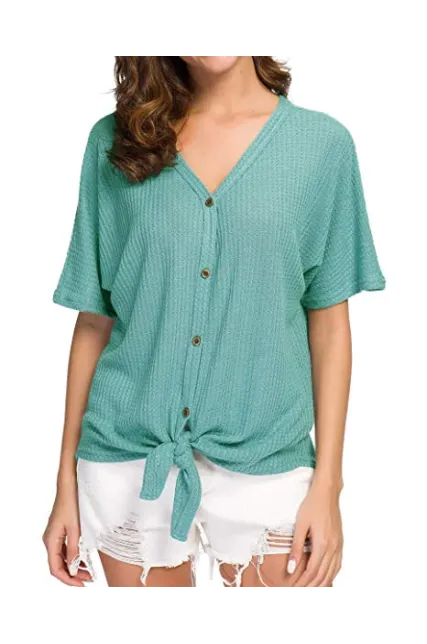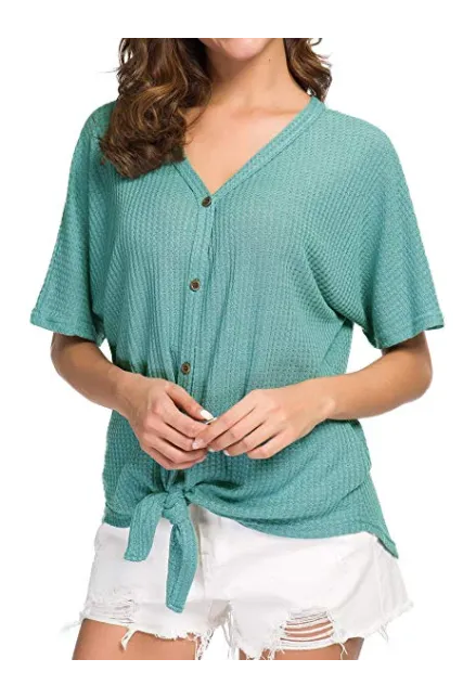 - Features: Waffle knitted blouse with button down design,Sexy V Neck,Short sleeve tunic tops, Curved hemline, Knotted detail in front, Loose fit Bat Wing Shirts.This casual top is perfect for any day of the week! It's so comfy with it's generous fit and light fabric! The button detailing and tied hemline are also very trendy!