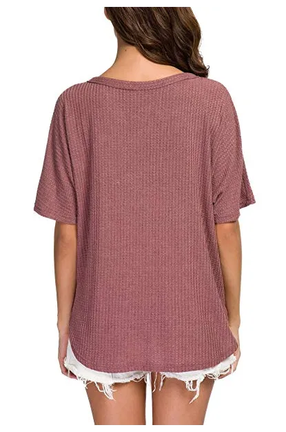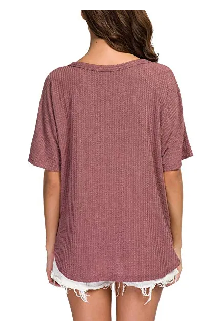 - Features: Waffle knitted blouse with button down design,Sexy V Neck,Short sleeve tunic tops, Curved hemline, Knotted detail in front, Loose fit Bat Wing Shirts.This casual top is perfect for any day of the week! It's so comfy with it's generous fit and light fabric! The button detailing and tied hemline are also very trendy!