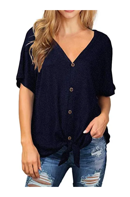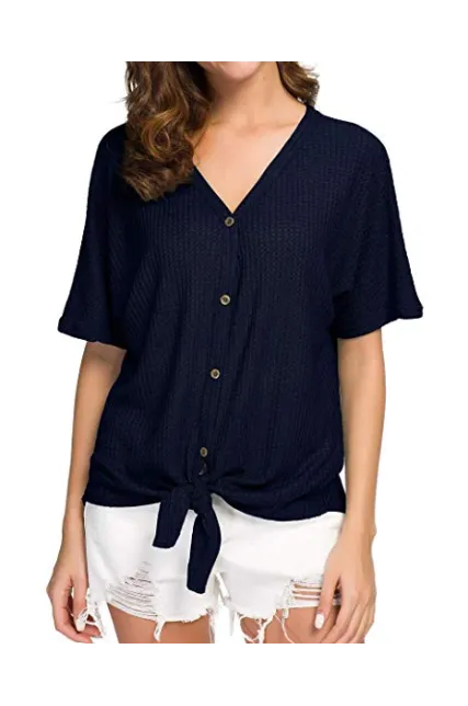 - Features: Waffle knitted blouse with button down design,Sexy V Neck,Short sleeve tunic tops, Curved hemline, Knotted detail in front, Loose fit Bat Wing Shirts.This casual top is perfect for any day of the week! It's so comfy with it's generous fit and light fabric! The button detailing and tied hemline are also very trendy!