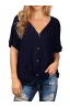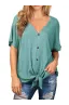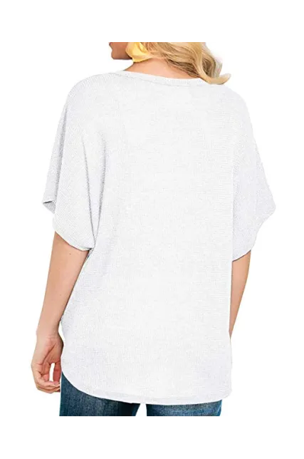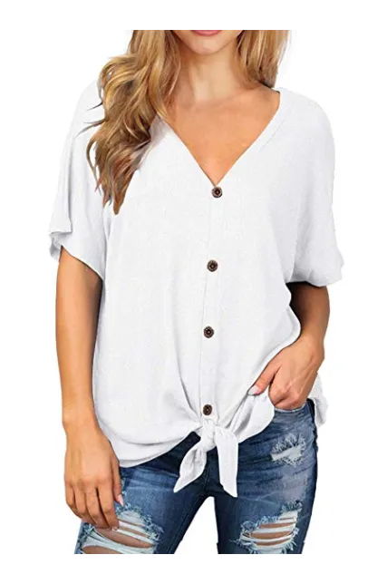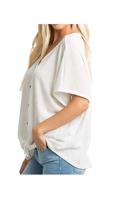 - Features: Waffle knitted blouse with button down design,Sexy V Neck,Short sleeve tunic tops, Curved hemline, Knotted detail in front, Loose fit Bat Wing Shirts.This casual top is perfect for any day of the week! It's so comfy with it's generous fit and light fabric! The button detailing and tied hemline are also very trendy!