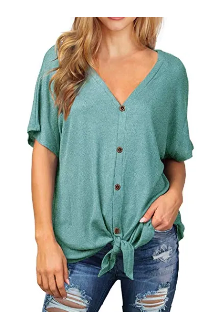- Features: Waffle knitted blouse with button down design,Sexy V Neck,Short sleeve tunic tops, Curved hemline, Knotted detail in front, Loose fit Bat Wing Shirts.This casual top is perfect for any day of the week! It's so comfy with it's generous fit and light fabric! The button detailing and tied hemline are also very trendy!