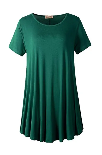- Figure flattering swing style short sleeve scoop neck top with flare hemline.