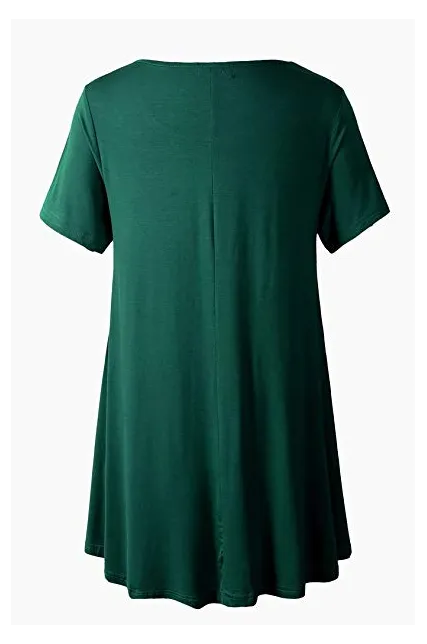 - Figure flattering swing style short sleeve scoop neck top with flare hemline.