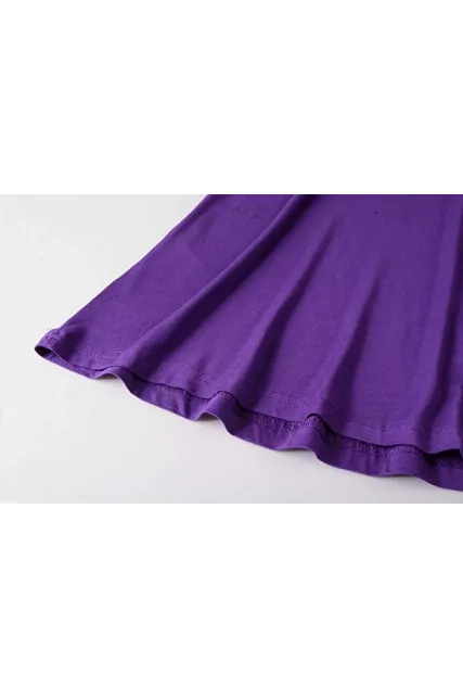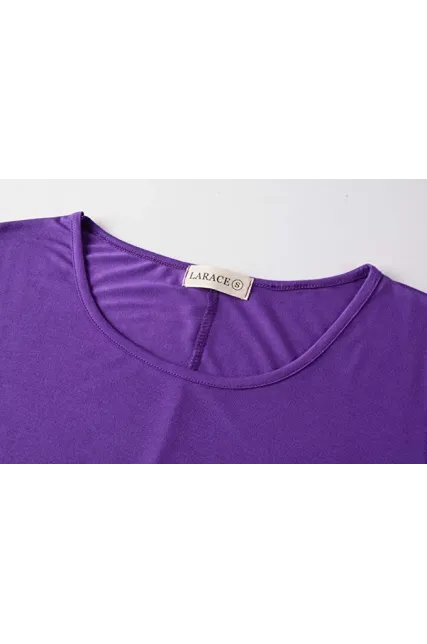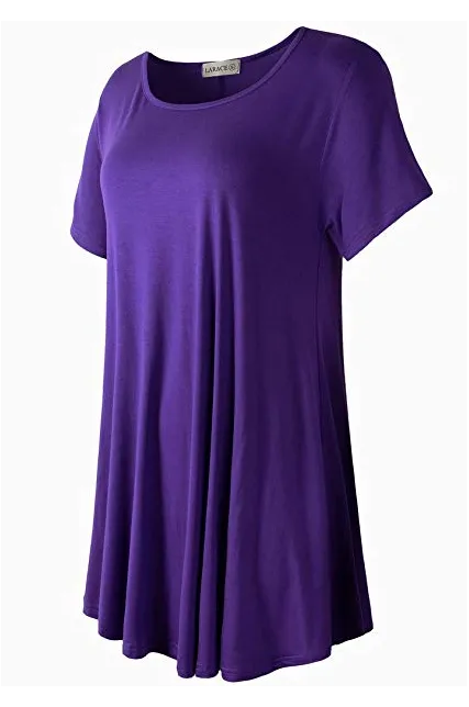 - Figure flattering swing style short sleeve scoop neck top with flare hemline.