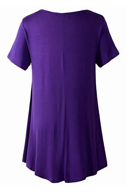 - Figure flattering swing style short sleeve scoop neck top with flare hemline.