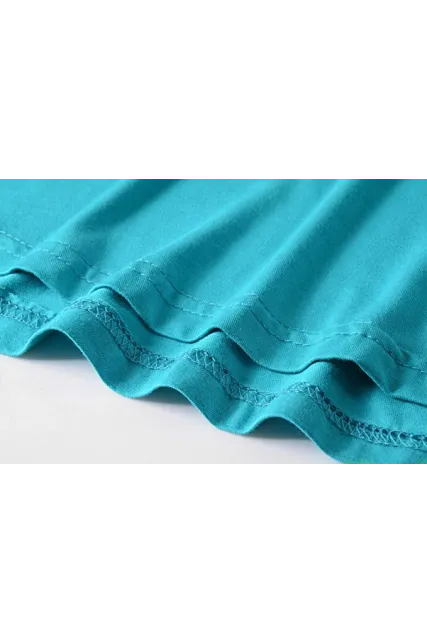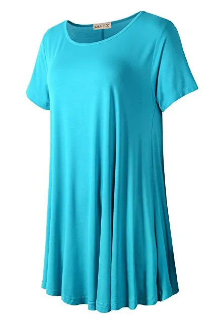 - Figure flattering swing style short sleeve scoop neck top with flare hemline.