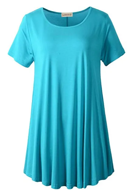 - Figure flattering swing style short sleeve scoop neck top with flare hemline.