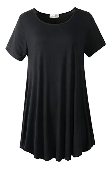 - Figure flattering swing style short sleeve scoop neck top with flare hemline.