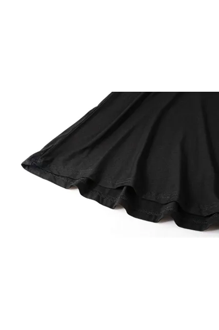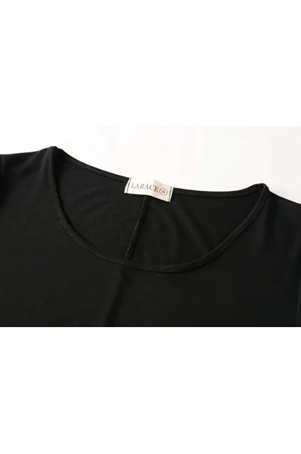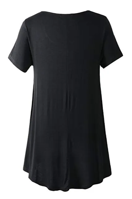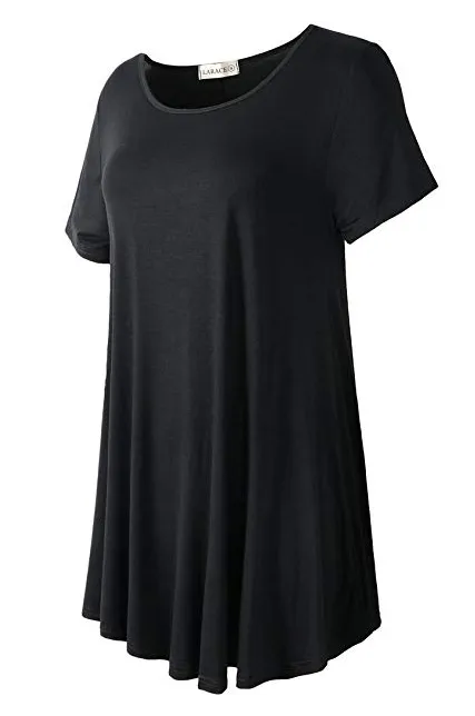 - Figure flattering swing style short sleeve scoop neck top with flare hemline.